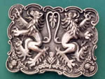 DOUBLE LIONS KILT BUCKLE - These two Rampant Lions among surrounding thistles are also the logo of the Rocky Mountain SCotish Athletes. They travel to Highland Games helping teach, organize and promote their sport. Known as aggressive competitors. This buckle is very popular and honors those men and women.